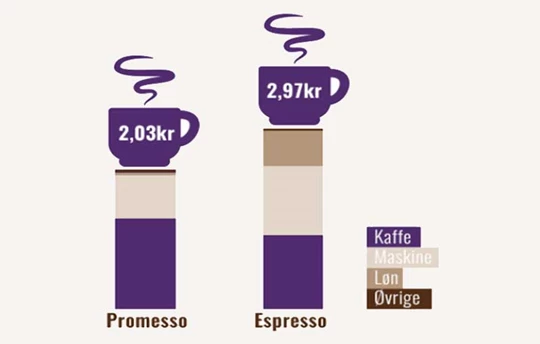 Når I udregner prisen per kop – og medtager parameter som kaffe, maskine samt de udgifter til løn (rengøring, vedligehold og genopfyldning) – får I et bedre overblik over de reelle udgifter.