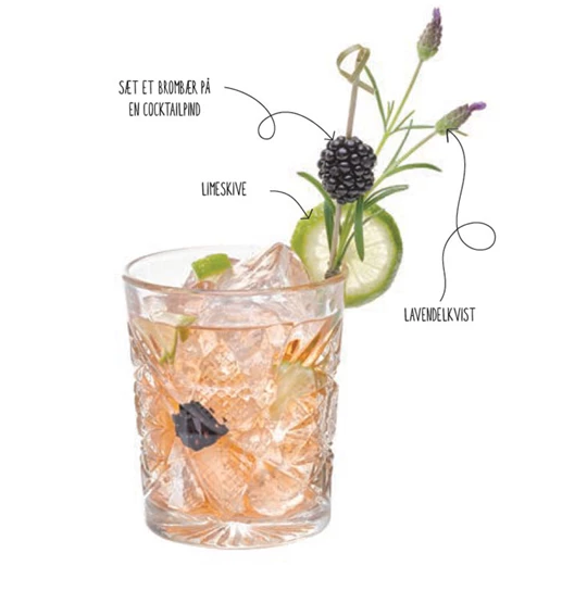 Tilsæt isterninger og friske ingredienser indtil kanden er godt fyldt.