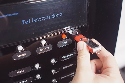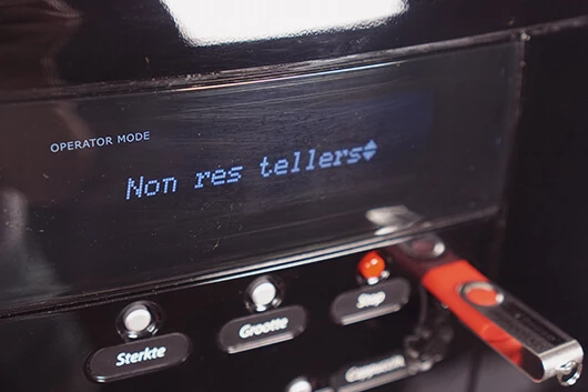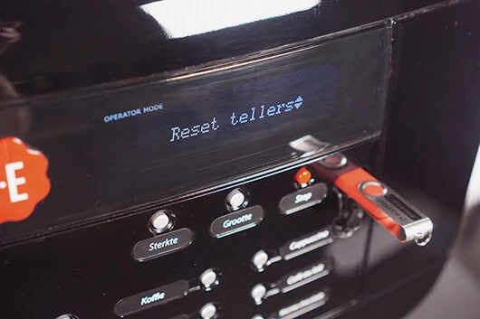 Steek de meegeleverde Cafitesse Operator Key (de USB-stick) in jouw Cafitesse Excellence Compact. Hierdoor start de operator modus automatisch. Je ziet in het display nu ‘tellerstanden’ staan.