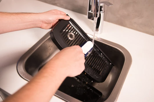 Remove the grid from the drip tray and empty the drip tray into the sink. Clean the drip tray and grid under running water with a washing up brush and then dry them with a clean cloth.