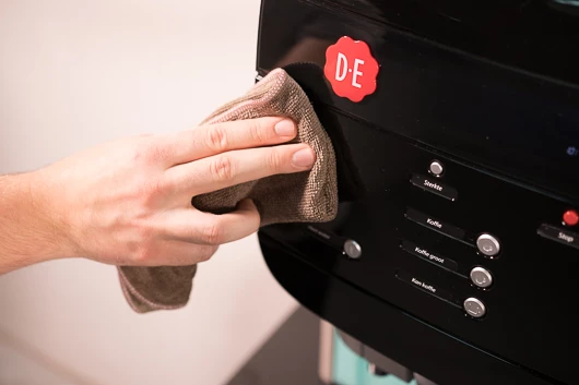 Using a clean damp cloth, wipe the outside of your coffee machine. Once you are done you can press the "standby" button again.