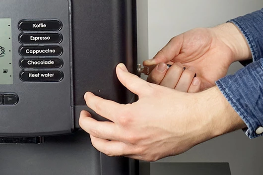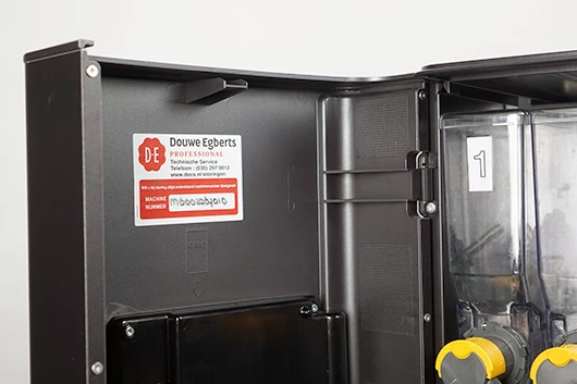 Maskinenummeret findes på mærkatet i døren. Hvis du har svært ved at læse maskinenummeret, kan det også findes i vedligeholdelsesbogen eller på bagsiden af din kaffemaskine.
