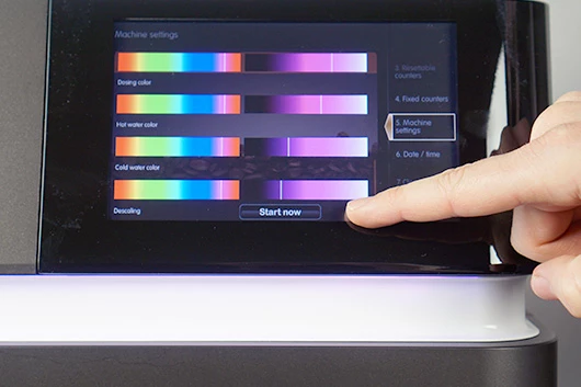 Vælg 'machine settings' (eller 'device settings'). Rul ned og vælg 'descaling' (eller 'descaling'). Tryk 'start now'.