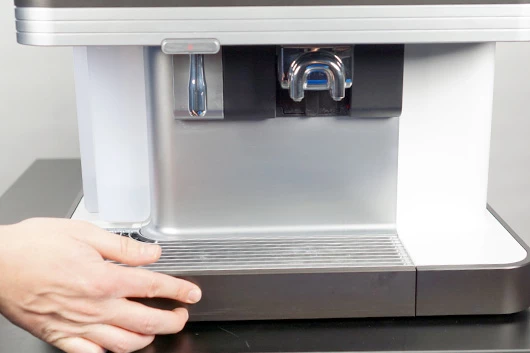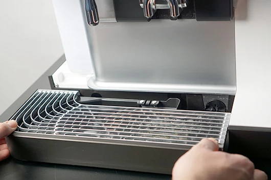 Du kan nu placere den medfølgende opsamlingsbakke på kafferisten under tuden.