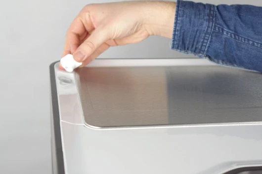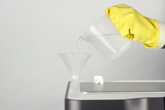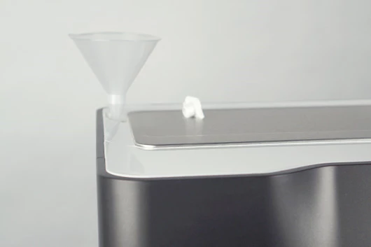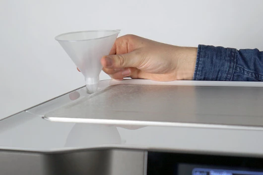 Tragten, som du modtog med din Promesso, kan placeres i afkalkningsåbningen.