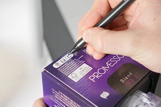 Skriv dagens dato på den nye emballage. Skriv udløbsdatoen ned i den anden boks. For mælken er dette 7 dage, for kaffen er det 21 dage.