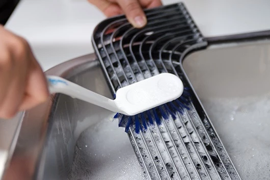 Med en opvaskebørste og opvaskemiddel kan du rengøre drypbakken og drypbakkens rist. Tør dem derefter med en ren, tør klud.