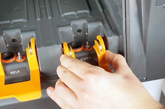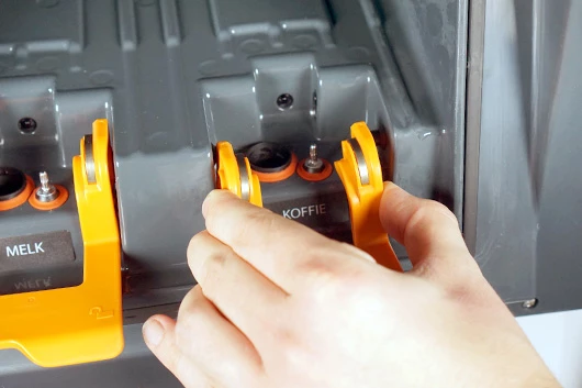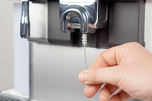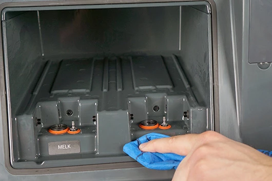 Rengør kaffe- og mælkeudløbene med den medfølgende børste. Tør dem derefter af med en ren fugtig klud.