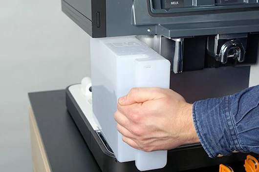 Vandbeholderen bør også rengøres regelmæssigt. For at gøre dette skal du først fjerne vandbeholderen fra kaffemaskinen.